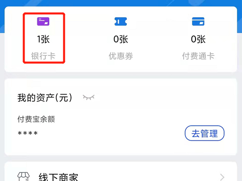1、打开付费通app,点击上方的银行卡。