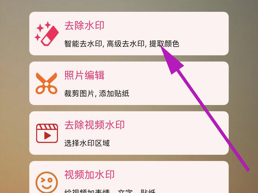 1、打开“去水印”,然后找到主页中的“去除水印”选项,然后点击进入。