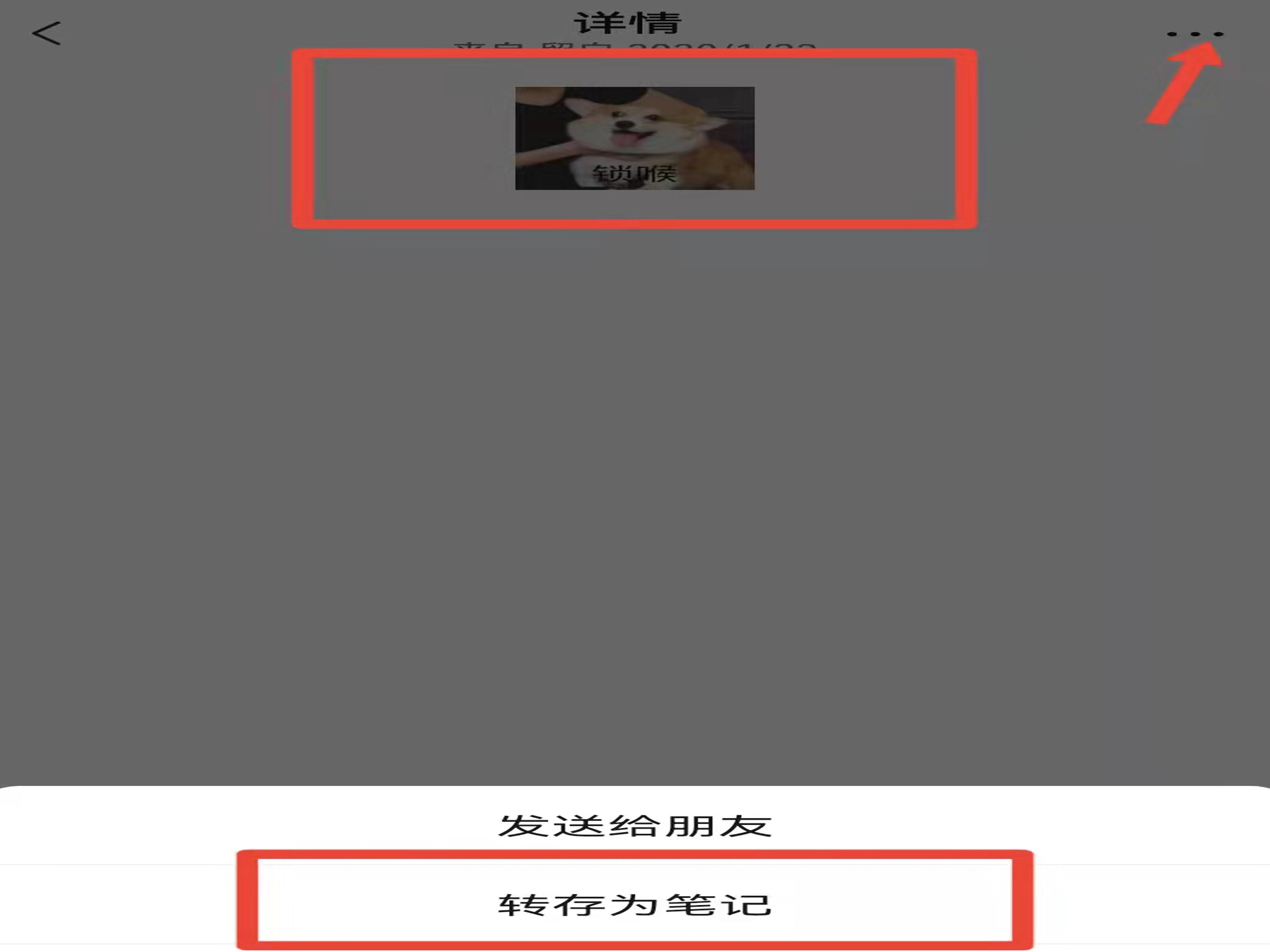 4、选择图片,在图片页面点击“三点”图标,选择“转存为笔记”。