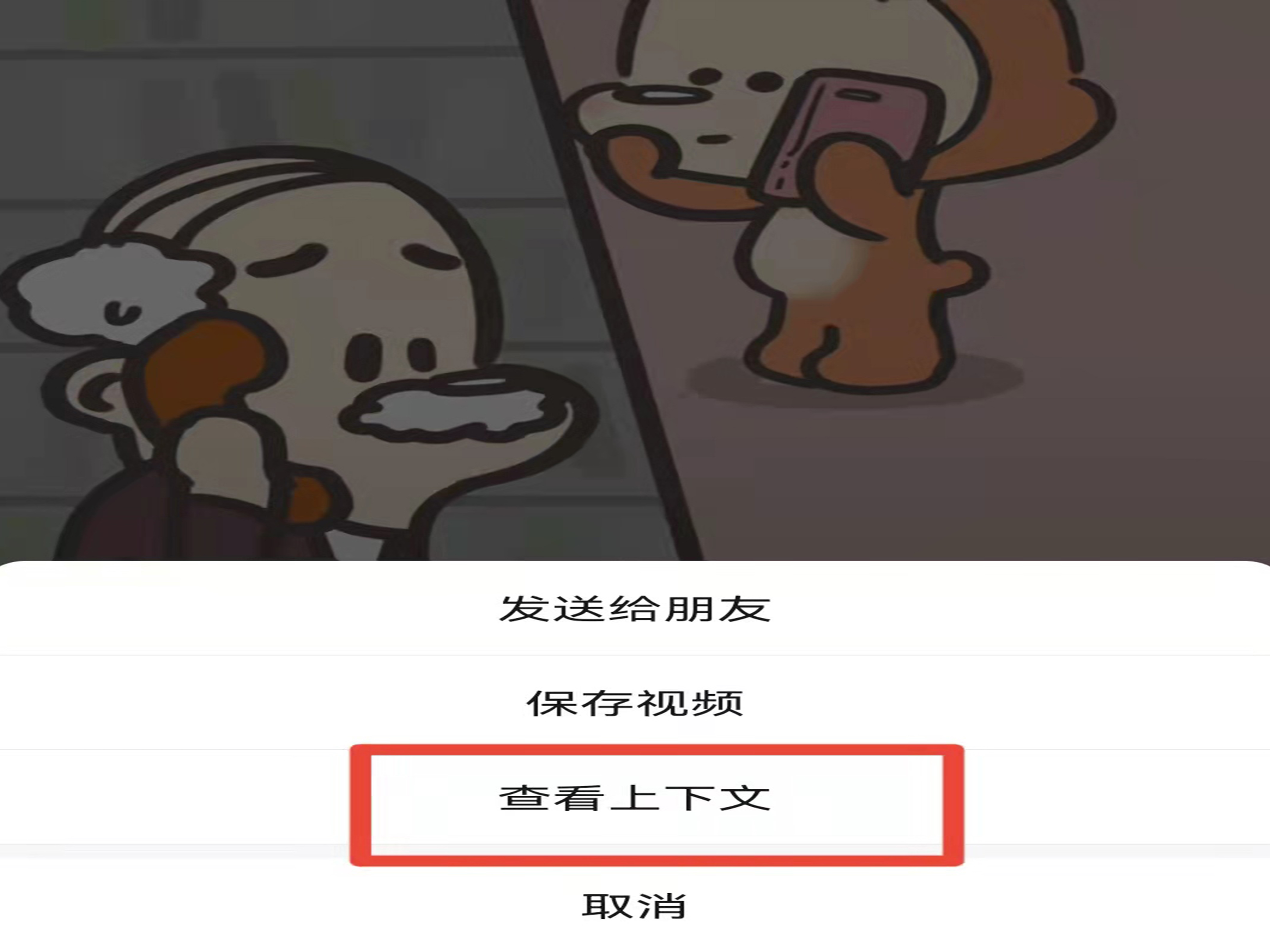 2、选中视频并长按,点击“查看上下文”。