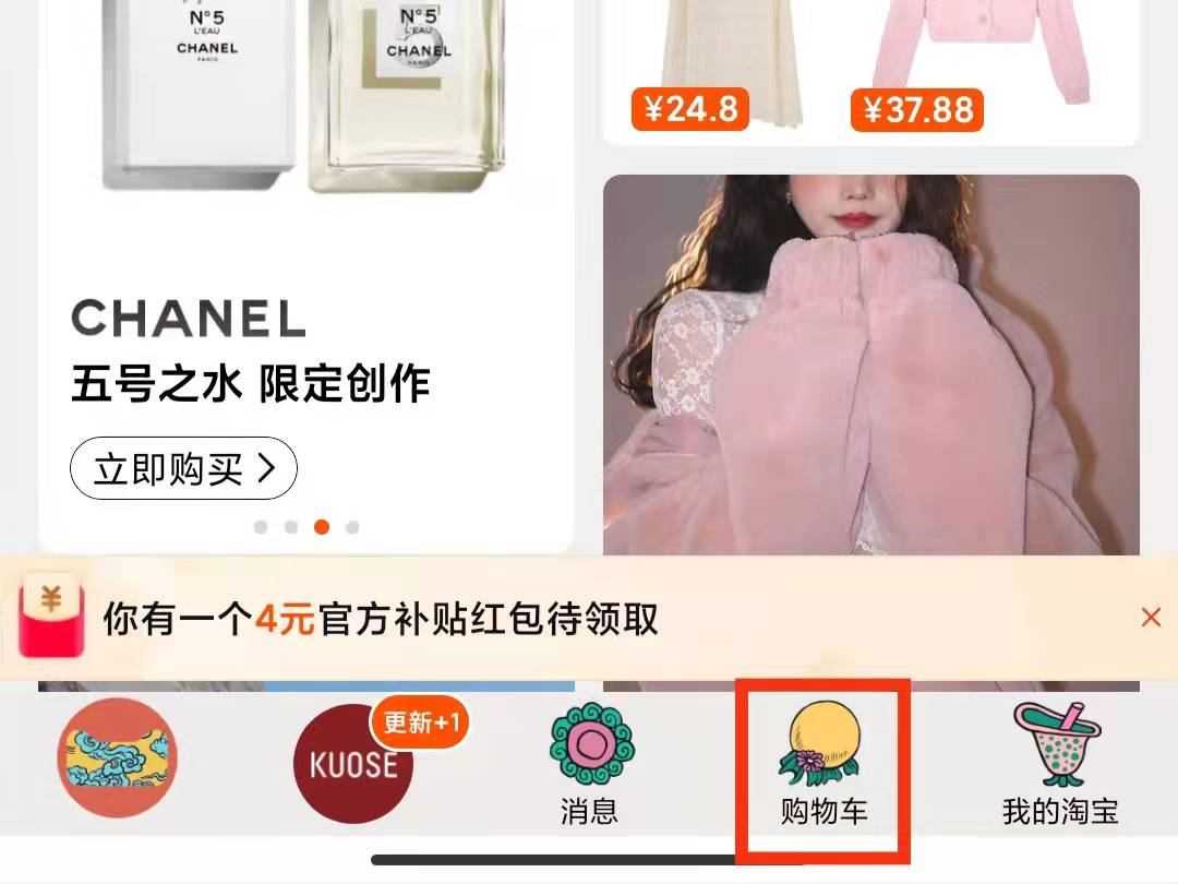 1、打开手机淘宝,在首页点击“购物车”,切换到购物车页面。