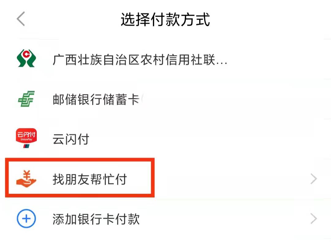 4、在新弹出的“选择付款方式”界面点击“找朋友帮忙付”即可。