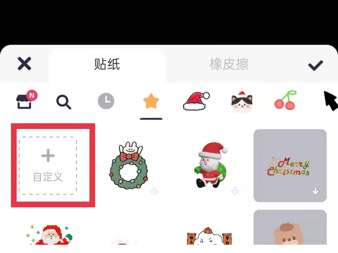 3、点击贴纸中的自定义,选择另一张图片,点击确定。