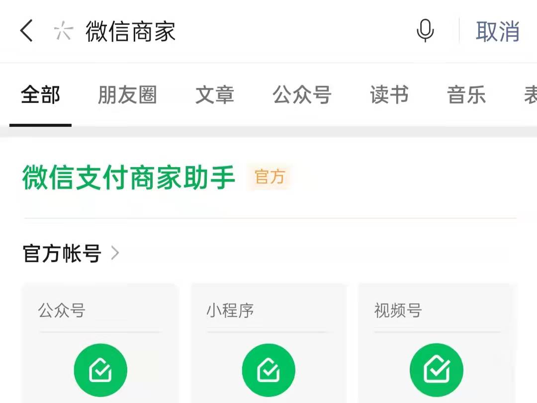 1、在微信搜索界面搜索微信商家,会出现微信支付商家助手官方服务。