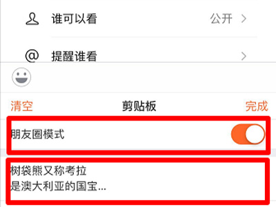 5、在“剪贴板”页面勾选“朋友圈模式”。