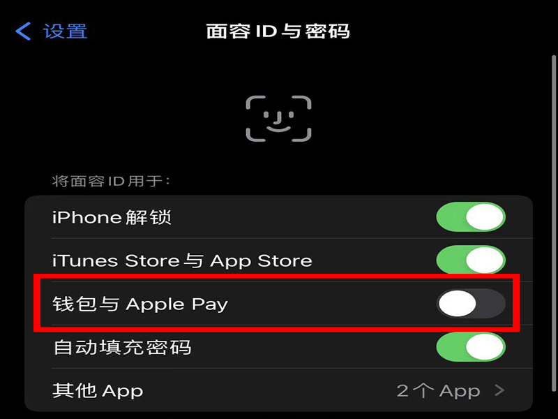 3、进入“面容ID与密码”界面后,点击“钱包与Apple Pay”旁边的符号将其打开即可。