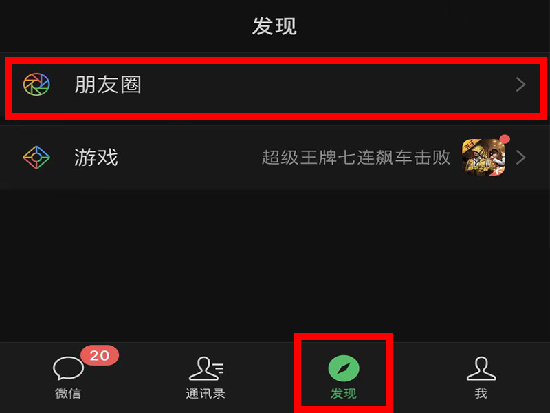 1、打开微信app,点击进入“发现”界面,再点击“朋友圈”。