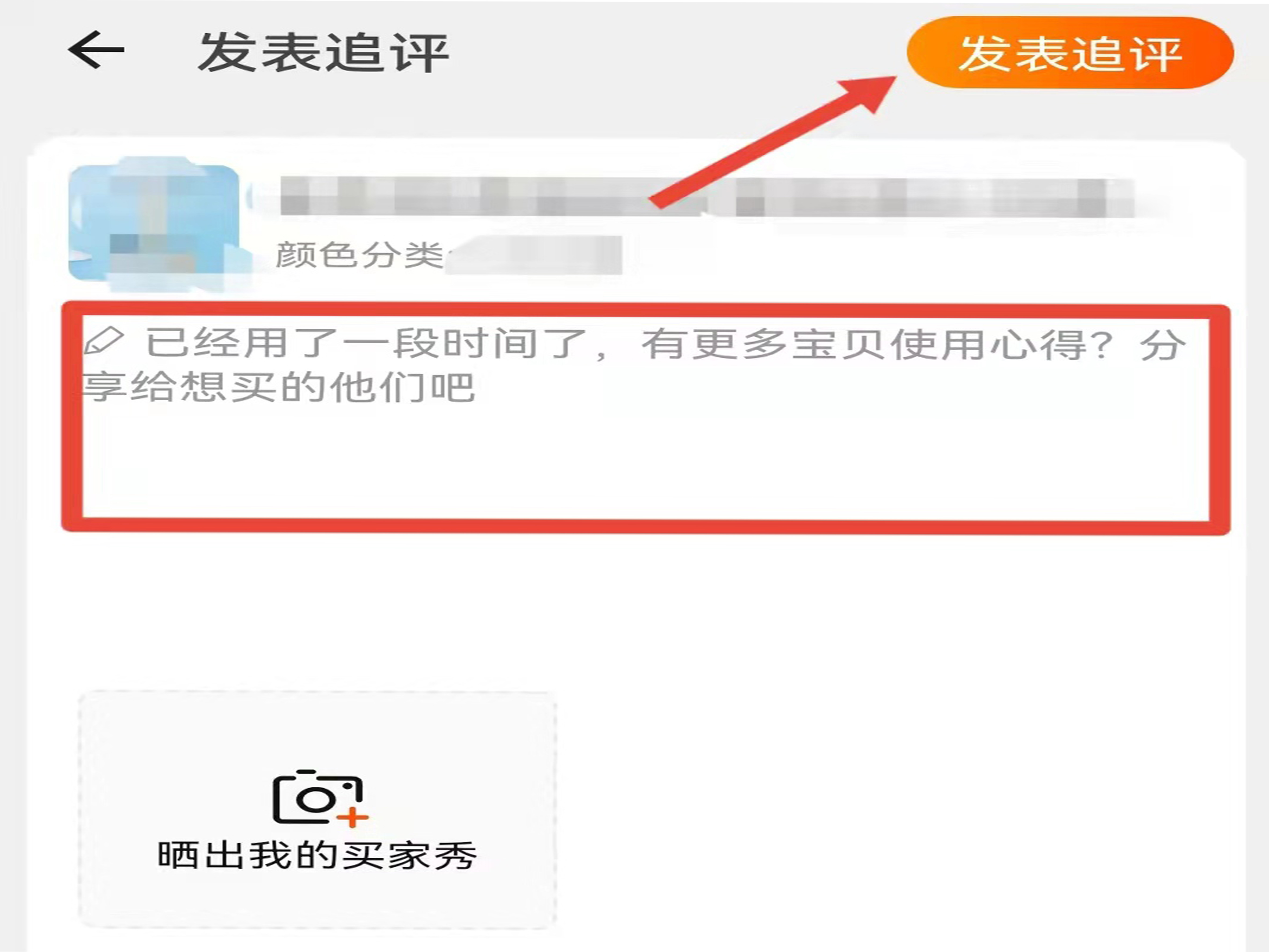 4、输入个人评价内容,点击“发表追评”即可完成。