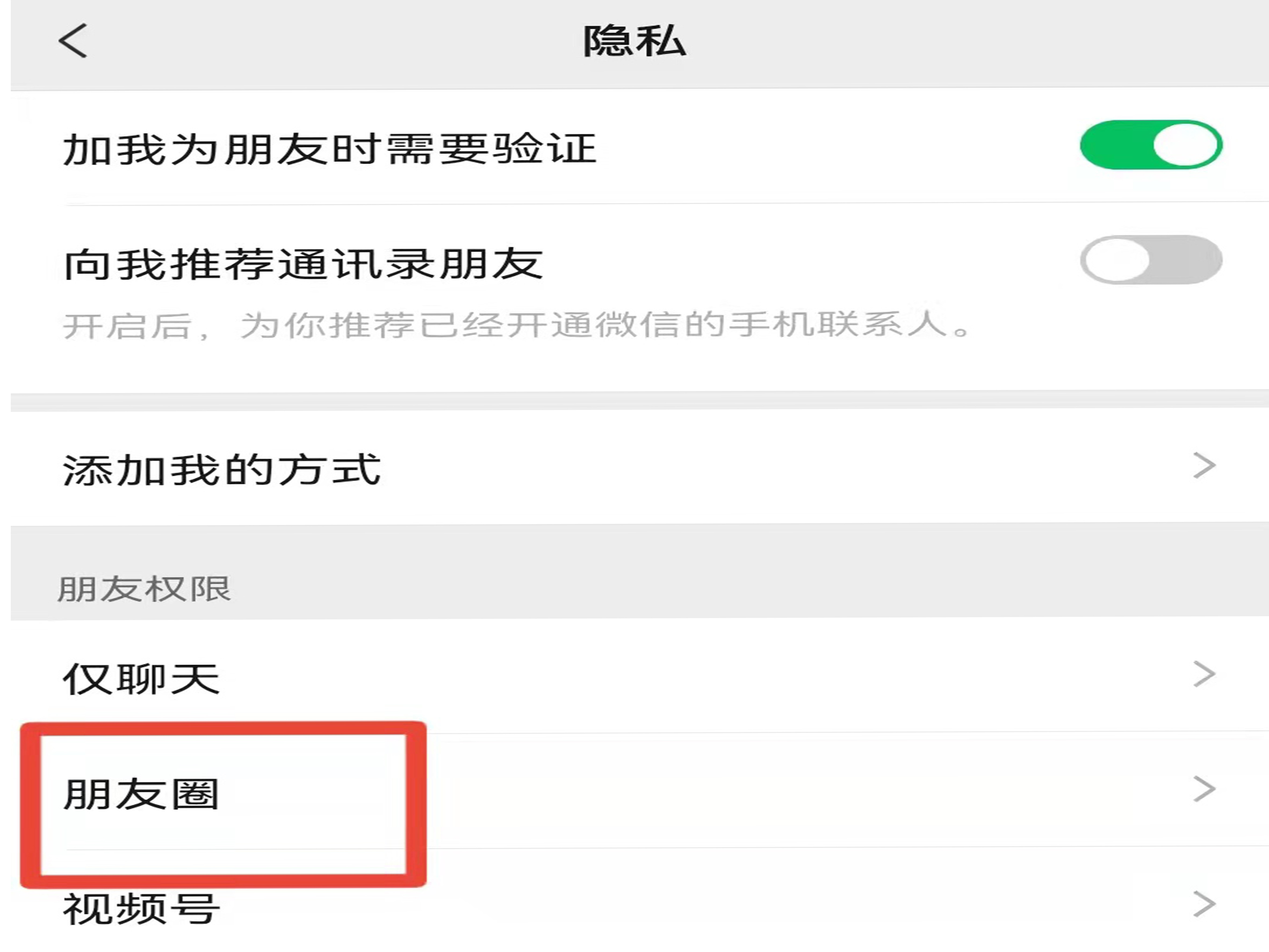2、点击“隐私”,选择“朋友圈”,切换到朋友圈页面。