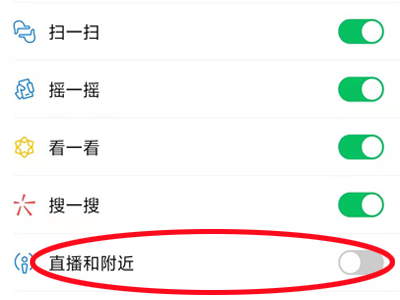 4、将“直播和附近”右侧的开关打开,这样“直播和附近”便会呈现在发现页。