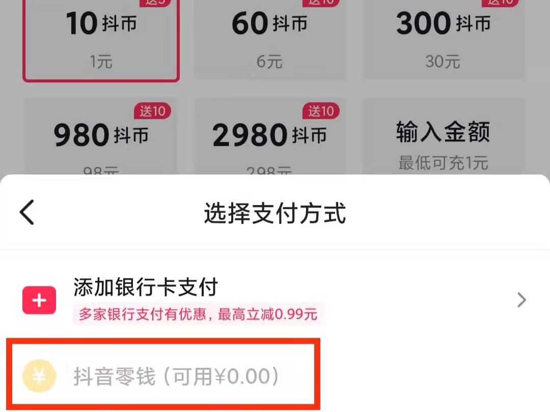 4、点击“添加银行卡支付”后,即可选择使用抖音零钱进行支付。