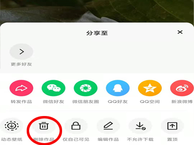 3、在作品播放页面点击“分享”,往右滑动最后一行,点击“删除作品”。