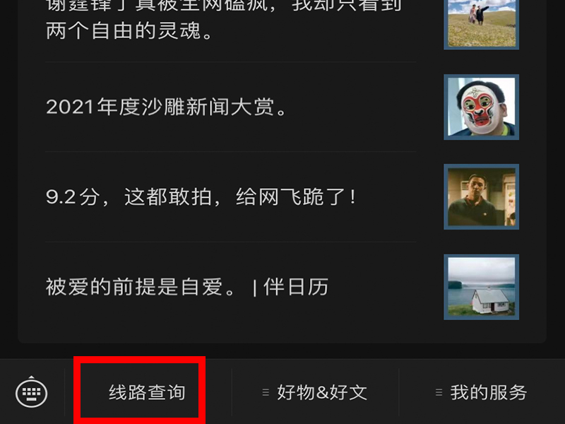 2、点击“弹出来”的公众号界面中点击下方的线路查询。