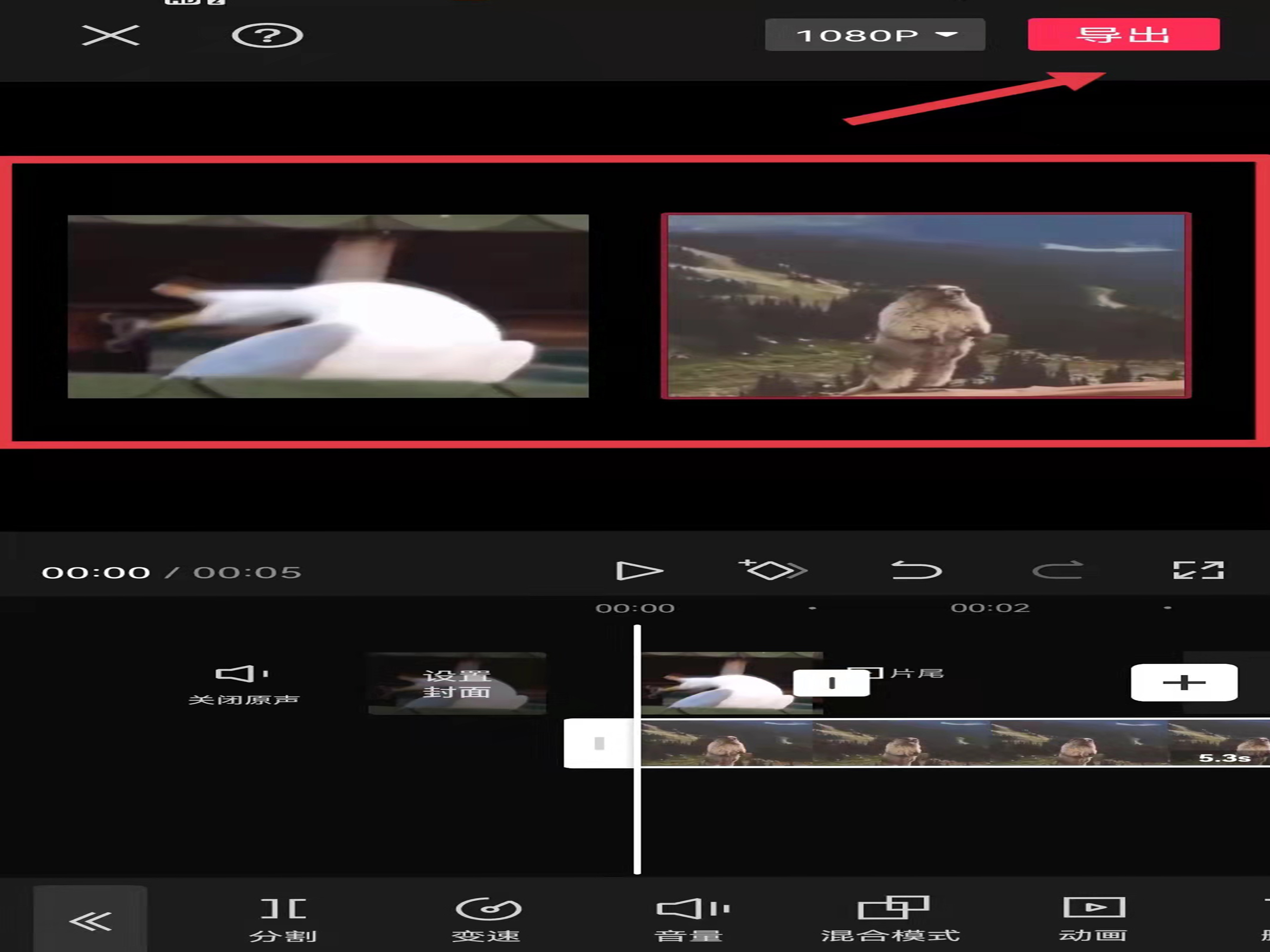 5、分别选中视频,双指摁住向内侧滑动,调整视频大小和位置,排列成一左一右,点击右上角的“导出”即可完成。