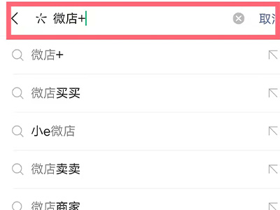 2、在页面搜索栏中输入“微店+”,进入程序。