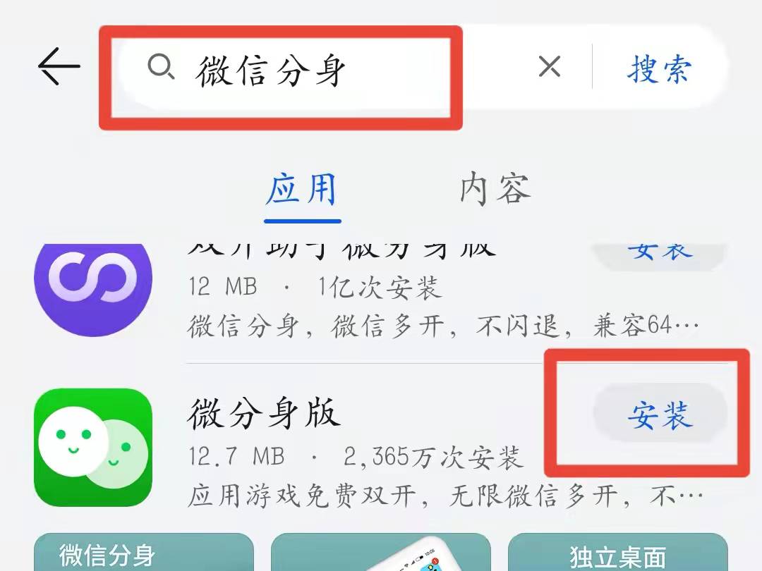 2、搜索“微信分身”,点击“微分身版”后的安装按钮,安装该软件。