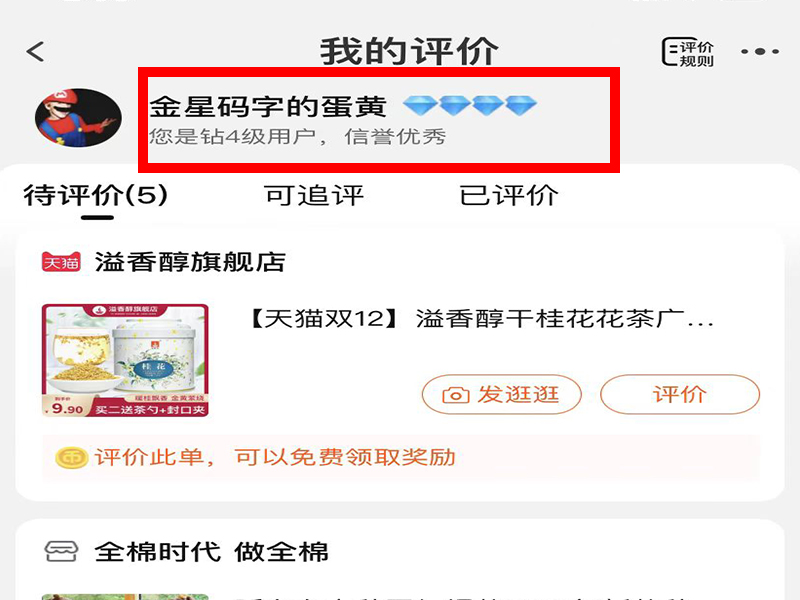 3、进入“我的评价”界面后,在界面上方就可以看到淘宝号等级了。