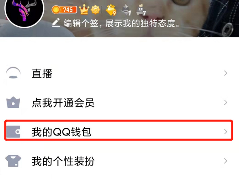 2、点击头像后,再点击我的QQ钱包进入钱包界面。