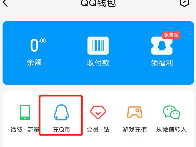3、进入QQ钱包界面后,点击“充Q币”,进入充值界面。