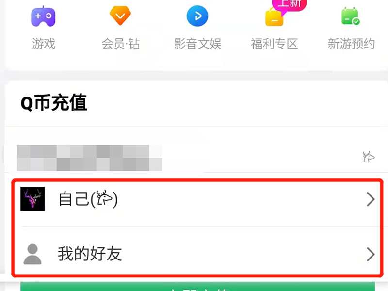 4、进入充值界面后,选择为自己充值或为好友充值。