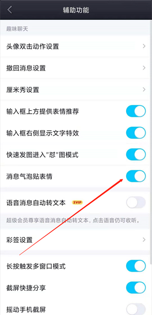4、开启“消息气泡贴表情”功能即可。