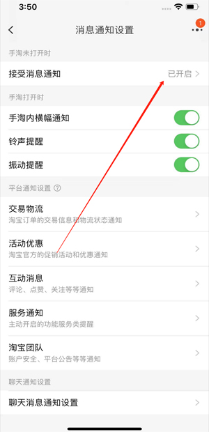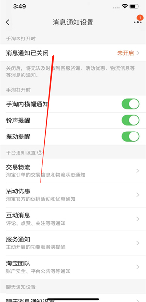淘宝的消息栏显示开启方法如下:1、打开淘宝,在“我的淘宝”界面中点击右上角的设置按钮。2、点击“消息通知”按钮。3、点击“消息通知已关闭”按钮。4、开启消息通知设置即可。