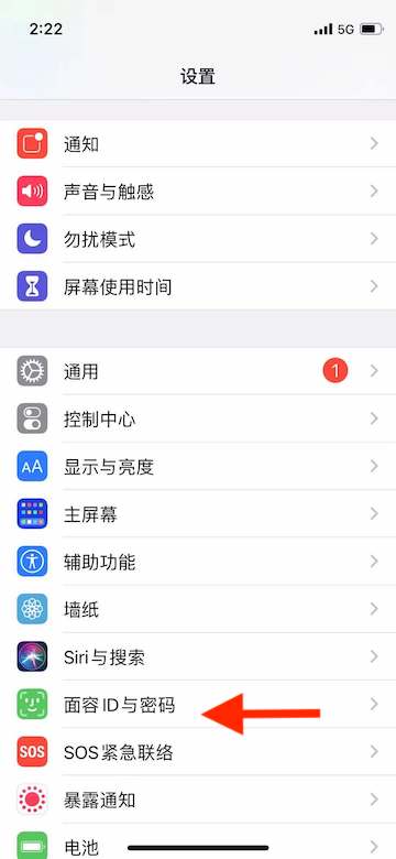 1、在设置中,选择“面容ID与密码”。