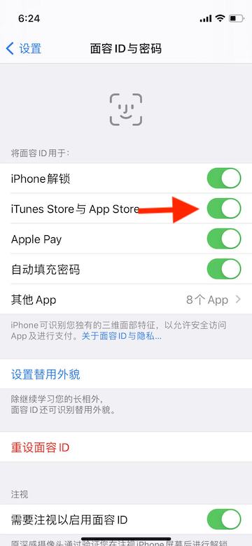2、进入后打开将面容ID用于“iTunes Store与App Store”的开关。