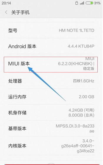 3、然后找到“MIUI版本”一项,连续点击直至显示“您现在处于开发者模式”为止。