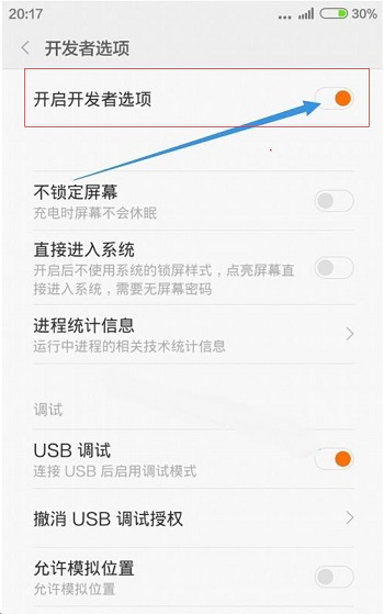 6、进入后将“开启开发者选项”一栏的开关开启即可。