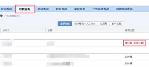 4、再进入“收信查询”里查看是否有记录,如果有记录,在操作栏中会显示对应的情况(可能会有被系统拦截、收信规则、黑名单等情况),如下图所示,这里有邮件被系统拦截。