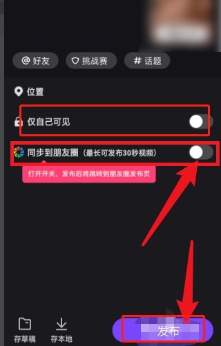 5、关闭“仅自己可见”旋钮,选择“同步到朋友圈”,再点击发布。
