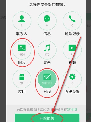 7、从旧手机选择需要备份的数据,再点击“开始换机”就可以将旧手机中的数据转移至新手机。