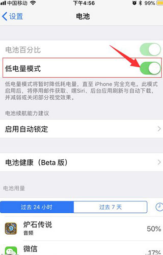 3、然后将“低电量模式”的开关关闭即可。如图: