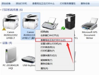 4、右键单击打印机,选择“查看现在正在打印什么”。