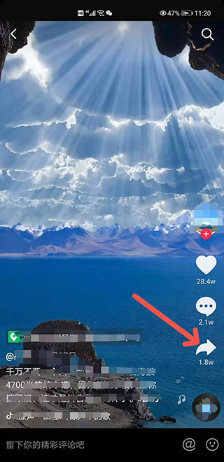 1、在抖音播放界面点击右边的“分享图标”,使其弹窗出菜单选项。如图: