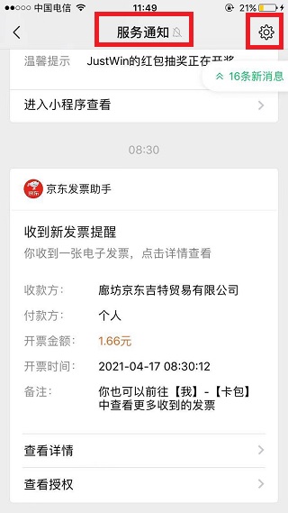 5、或者打开服务通知页面,找到小程序的消息,比如点赞抽奖小程序。