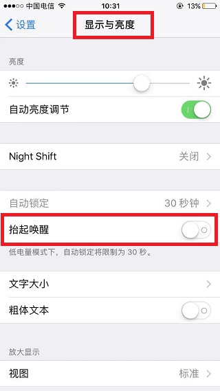 3、在打开的显示与亮度页面将抬起唤醒按钮关闭。
