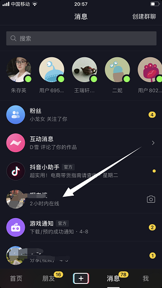 2、然后,你可以在抖音中看到所有的会话列表,单击其中一个会话。