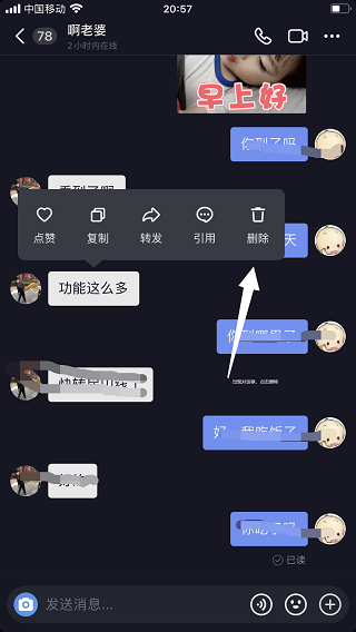 4、长按后,点击“删除”命令,“删除”命令从右到左第一个就是。点击删除聊天记录即可。