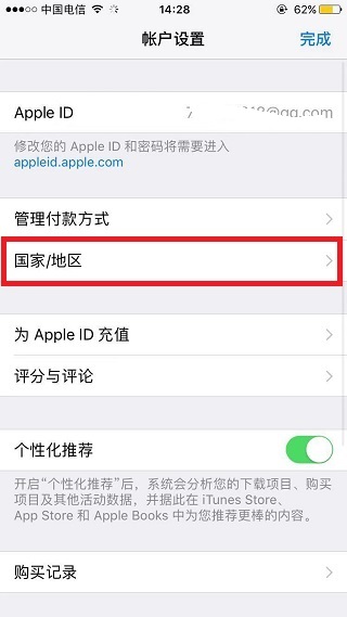 4、在Apple ID账户设置中,点击国家/地区。