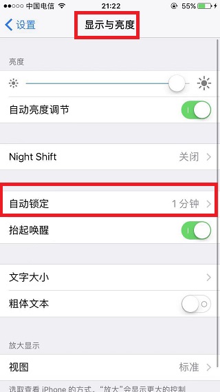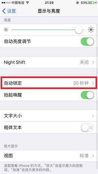3、在打开的显示与亮度页面点击自动锁定按钮。