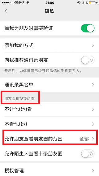 3、在隐私页面找到允许朋友查看朋友圈的范围,点开。