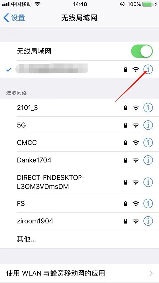 3、接着点击我们所连接的WiFi右侧的感叹号,如下图所示。