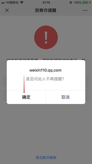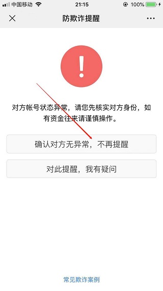 2、进入防欺诈提醒页面,点击【确认对方无异常,不再提醒】,如下图所示。