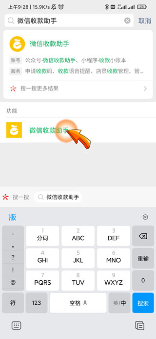 2、然后在索栏中输入微信收款助手,点击下方弹出的“微信收款助手”选项。