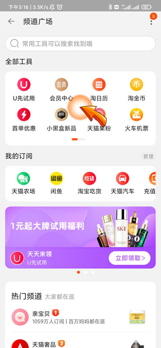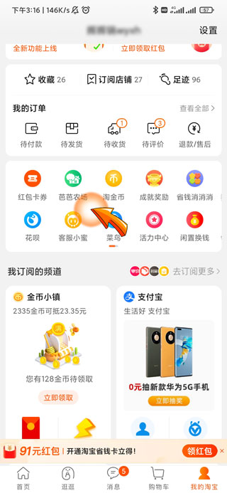 2、然后向左滑动我的淘宝页面“图标”选项区域。