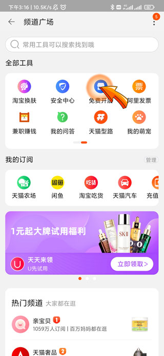 5、最后点击“免费开店”图标即可进行淘宝卖家申请。