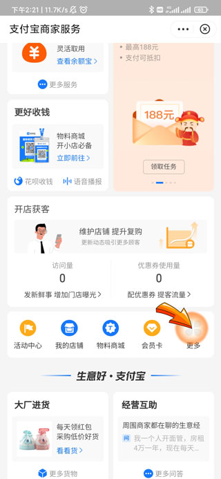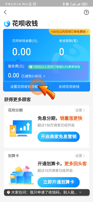 花呗收款设置150元以上需要打开支付宝APP,点击右下角“我的”图标,然后点击“商家服务”选项,进入页面后找到“更多”图标,之后点击“花呗收钱”选项,最后点击“设置花呗收钱额度”选型即可。