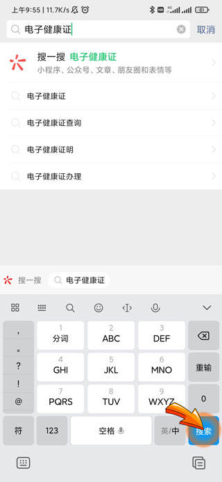 3、输入电子健康证文字后点击右下角的“搜索”选项。